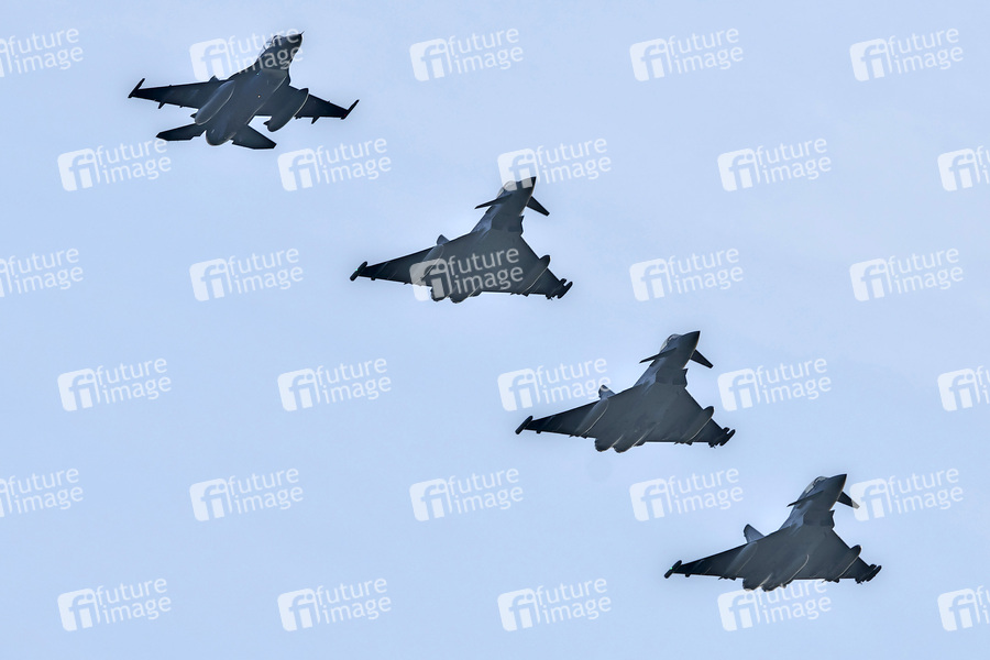 Eine japanissche Mitsubishi F-2 und drei Eurofighter Typhoon der deutschen Luftwaffe auf dem Luftwaffenstützpunkt Hyakuri. Zum ersten Mal besuchen deutsche Eurofighter Japan. Der Besuch der Eurofighter in Japan folgt auf mehrwöchige internationale Manöver in Australien, bei denen die Deutschen auch mit japanischen Soldaten geübt haben. Omitama, 28.09.2022