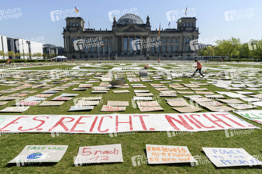 Der 5. Globale Klimastreik der Umweltbewegung Fridays for Future findet online (#NetzstreikFürsKlima) und vor dem Berliner Bundestag statt. Wegen der Corona-Eindämmungsverordnung und entsprechender Versammlungs- und Kontaktverbote, konnte keine Demonstration von Fridays For Future stattfinden. Aktivisten waren dazu aufgerufen Proterstplakate zu entwerfen, die vor dem Reichtagsgebäude von wenigen Aktivisten ausgelegt wurden. Berlin, 24.04.2020