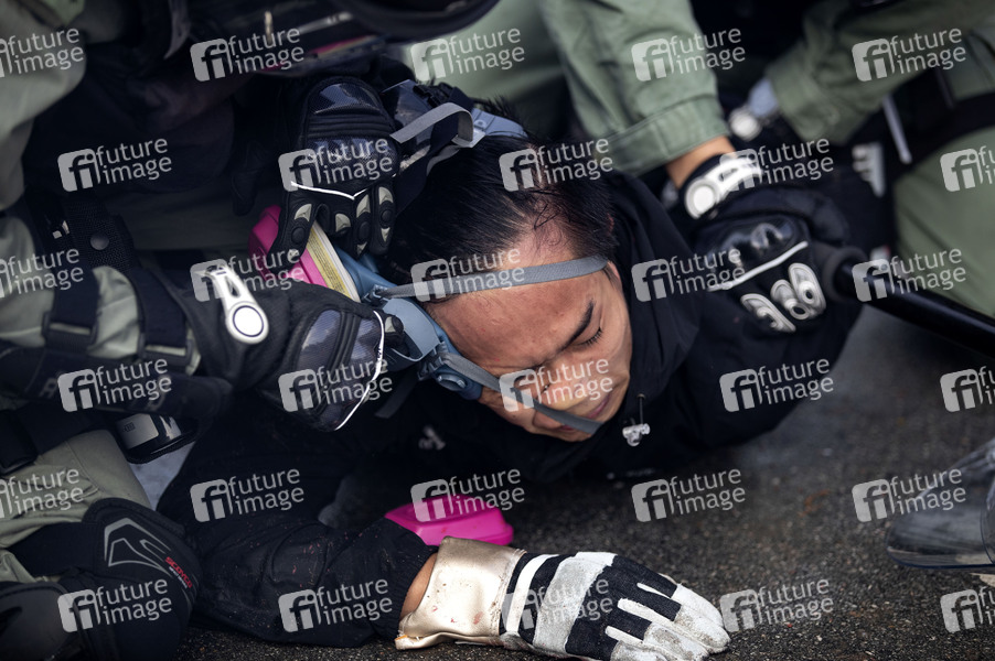 Die Polizei nimmt dem Studenten während der Verhaftung die Maske ab - Kampf an der Chinese University Hong Kong (CUHK). Hongkong protestiert seit fünf Monaten ununterbrochen. Am Montag, dem 11. November 2019, begann ein Streik in der ganzen Stadt, der Teile von Hongkong zum Erliegen brachte, als MTR-Stationen geschlossen und mehrere Straßensperren errichtet wurden. Hongkong, 12.11.2019