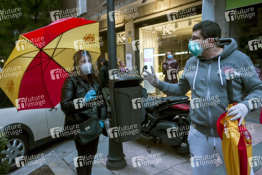 Proteste gegen die Corona-Eindämmungsmaßnahmen in der Calle Nunez de Balboa. Die rechtsextreme Partei Vox hat die Bürger aufgefordert mit Protesten gegen die Regierung 'die Straßen zurück zu erobern'. Madrid, 14.05.2020