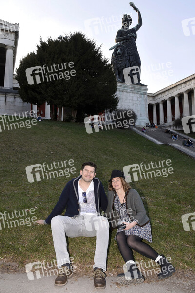 Max Kronseder (DeSchoWieda) und Christina Schmideder beim Videodreh zum Lied 'Radlg'fahrn und G'schmissn' der Guten A-Band im Bavariapark und auf der Theresienwiese. München, 26.03.2021