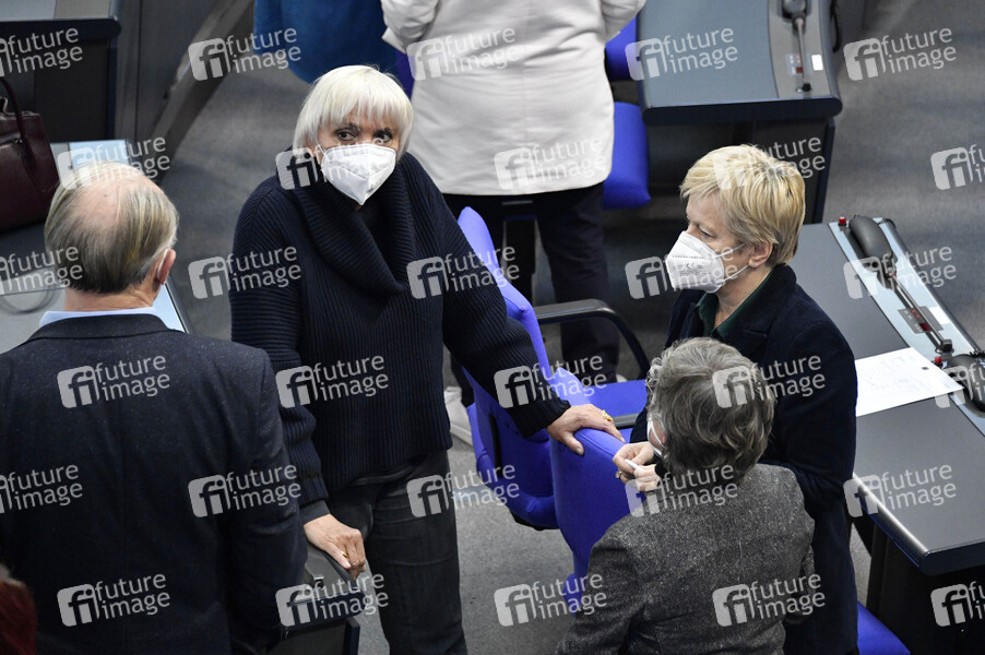 Jürgen Trittin, Claudia Roth, Britta Haßelmann und Renate Künast in der 208. Sitzung des Deutschen Bundestages im Reichstagsgebäude. Berlin, 10.02.2021