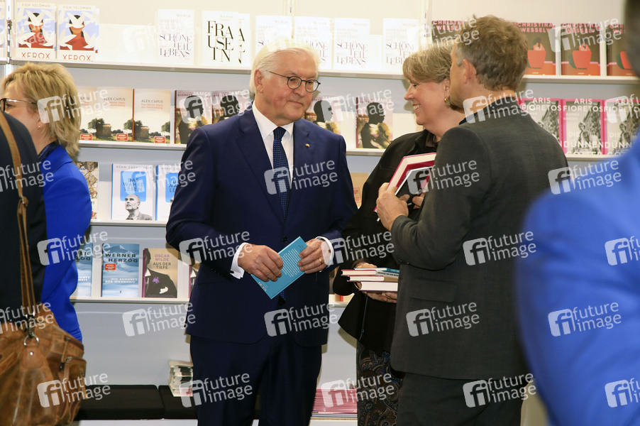 Frank-Walter Steinmeier, Christina Knecht und Jo Lendle am Stand vom Carl Hanser Verlag auf der Leipziger Buchmesse 2024 auf dem Messegelände. Leipzig, 21.03.2024