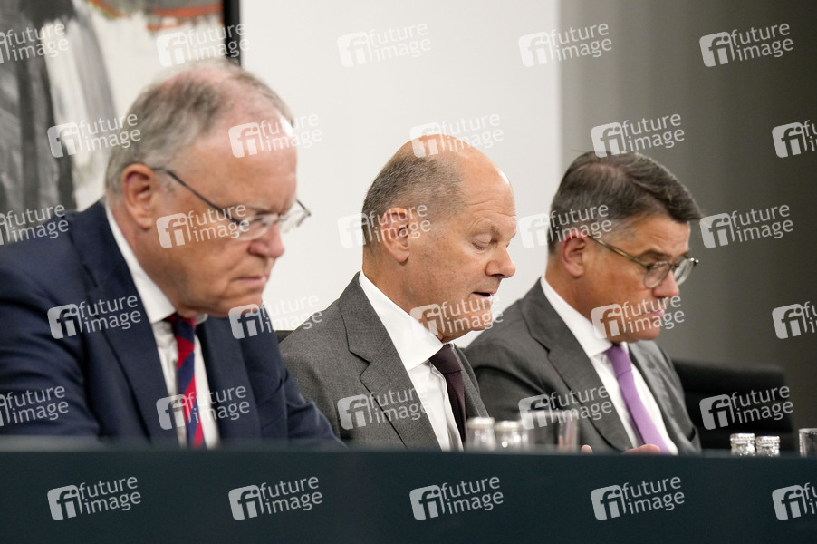 Stephan Weil, Olaf Scholz und Boris Rhein bei der Pressekonferenz im Anschluss an die Beratungen der Bundesregierung mit den Regierungschefinnen und Regierungschefs der Länder im Bundeskanzleramt. Berlin, 20.06.2024