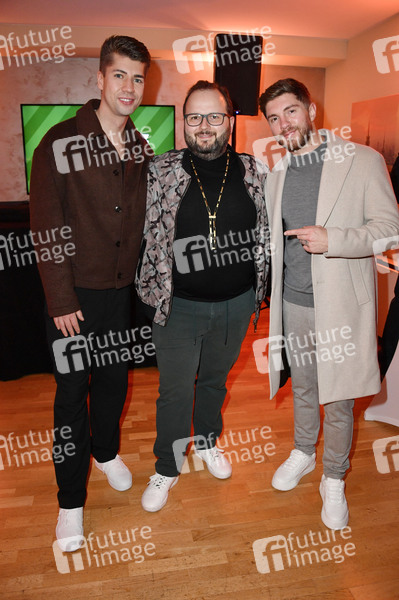 Maximilian Seitz, Gast und Joey Heindle bei der 4. Charity Promi Pack 2024 Aktion von Maximilian Seitz in der Mall of Berlin. Berlin, 27.11.2024