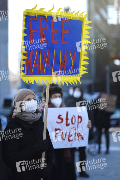 Mehrere hundert Demonstranten und Putin-Gegner demonstrieren in Berlin für die Freilassung des russischen Oppositionspolitikers Alexej Nawalny / Alexei Navalny aus russischer Haft. Sie fordern die Freilassung aller politischen Gefangenen und mehr Demokratie in Russland. Berlin, 31.01.2021