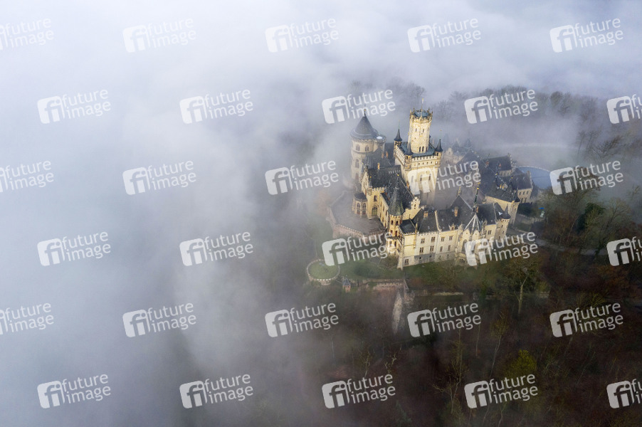 Luftaufnahme, Nebel, Sonnenaufgang, Morgenstimmung, Wald, Bäume, Morgendämmerung, Nordstemmen, Schloss, Sonnenuntergang, Landschaft, offizieller Wohnsitz der Prinzen von Hannover, Welfen, Bauzeit 1857-1867, Ernst August von Hannover, Neugotik, Architekt: Conrad Wilhelm Hase, Marienberg