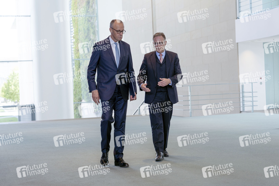Friedrich Merz und Bart de Wever beim Empfang des Premierministers von Belgien mit militärischen Ehren zu einem gemeinsamen Gespräch mit anschließendem Pressestatement im Bundeskanzleramt. Berlin, 26.08.2025