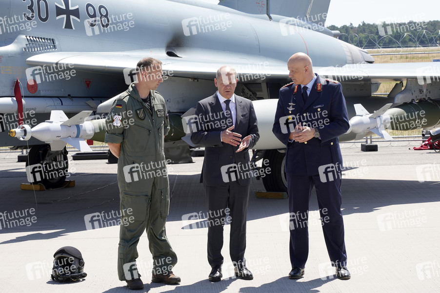 Stefan Schneemilch, Olaf Scholz und Ingo Gerhartz vor einem Eurofighter bei der ILA-Eröffnung mit anschließendem Rundgang auf dem ILA-Gelände am Flughafen BER Berlin-Brandenburg. Berlin, 22.06.2022