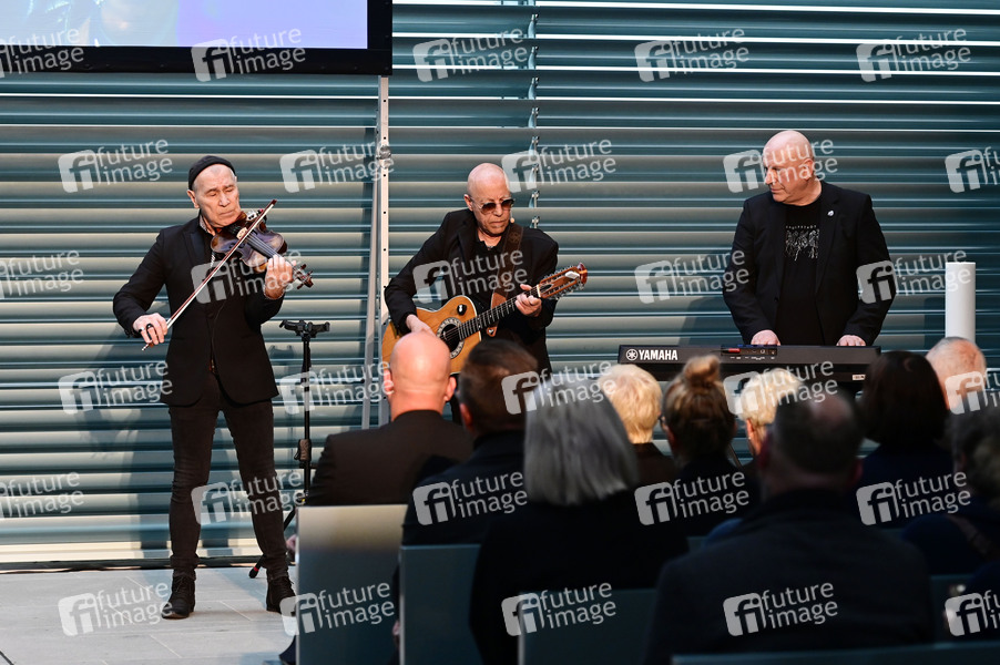 Georgi Gogow, Toni Krahl und Manfred Hennig von City bei der Gedenkfeier für den verstorbenen Gitarristen von City, Fritz Puppel, im Krematoriumsgebäude Baumschulenweg. Berlin, 10.04.2024