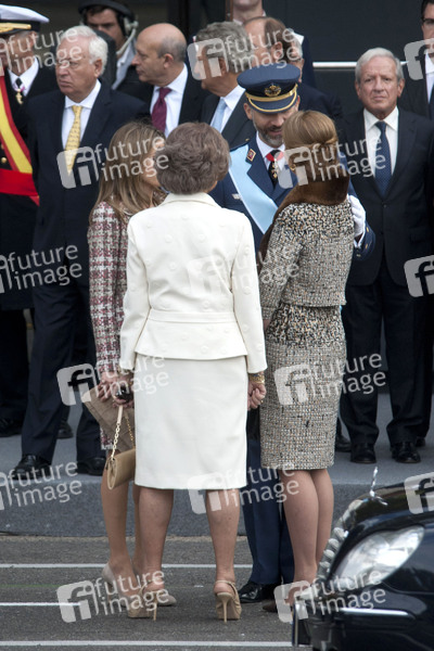 Die spanische Königsfamilie bei der Hommage an die Nationalflagge mit Militärparade am Palacio Real, Madrid