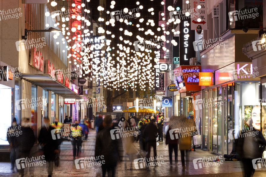 Passanten laufen mit Masken durch die Hohe Straße, wo schon Weihnachtsbeleuchtung und Weihnachtsdekoration hängen. Aufgrund der Corona-Pandemie gelten in Kölner Einkaufszonen Corona-Regeln wie etwa die Maskenpflicht oder das Einhalten von Mindestabstand. (Symbolbild, Themenbild) Köln, 06.12.2020