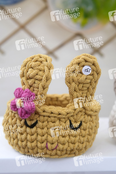 Körbe, Schalen, Taschen in Häkeltechnik, moderne Handarbeiten von Dirka Niggl. Das Gelbe vom Ei - kunsthandwerklicher Ostermarkt auf dem Karl-August-Platz in Charlottenburg (Symbolfoto, Themenfoto). Berlin, 24.03.2024