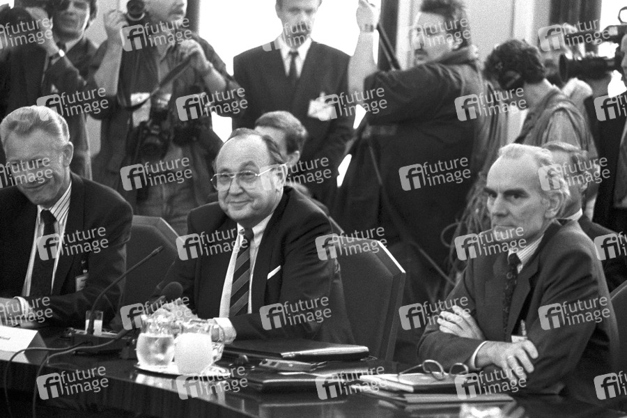 Außenminister, Minister, Politiker, FDP, BRD, DDR, Deutsche Demokratische Republik, Bundesrepublik Deutschland, Ostberlin, Zeitgeschichte, Zeigeschehen, zwei plus vier, zweiplusvier, 2plus4, 2+4, Außenministertreffen, Wiedervereinigung, Wende, Wendezeit, Wendejahr, Vereinigung, Verhandlungen, Treffen, Konferenz, Alliierte, Einheit, Schloß Hohenschoenhausen