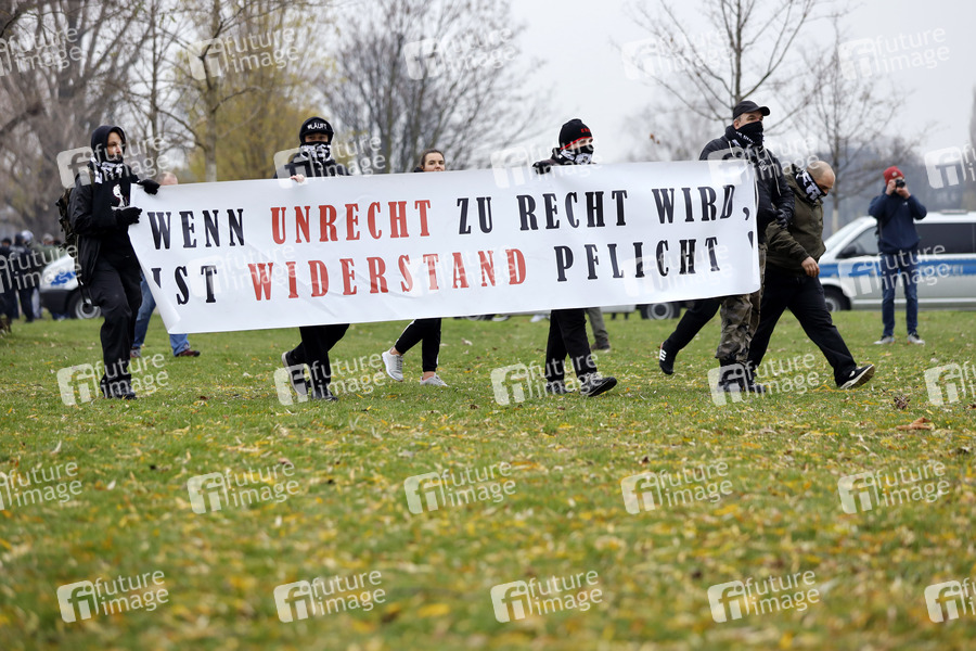 Hooligans auf der Querdenken-Demo im Rheinpark Golzheim zeigen ein Transparent 'Wenn Unrecht zu Recht wird, ist Widerstand Pflicht'. Düsseldorf, 06.12.2020