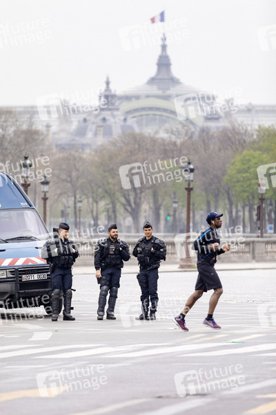 Sicherheitskräfte der französischen Gendarmerie bewachen wichtige Straßen und errichten Checkpoints rund um den Champ Elysees. Paris, 23.03.2019