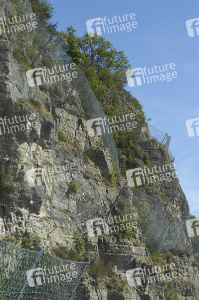 Sicherheit, Schutz bei Extremwetterlagen, Steinschlag, Sicherung, Geröll, Gestein, Steine, Felsen, Straße, Hangbefestigung, Böschungssciherung, Steinschlagsicherung, Gelände, Sicherungszäune, Symbolfoto, Symbolbild