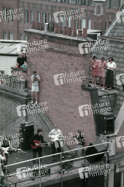Will Sergeant, Ian McCulloch und Les Pattinson von Echo & the Bunnymen live bei einem Rooftop-Konzert zum 20 jährigen Jubiläum des Beatles-Albums 'Sgt. Pepper’s Lonely Hearts Club Band' auf dem Dach vom HMV Record Store in der Oxford Street. London, 06.07.1987