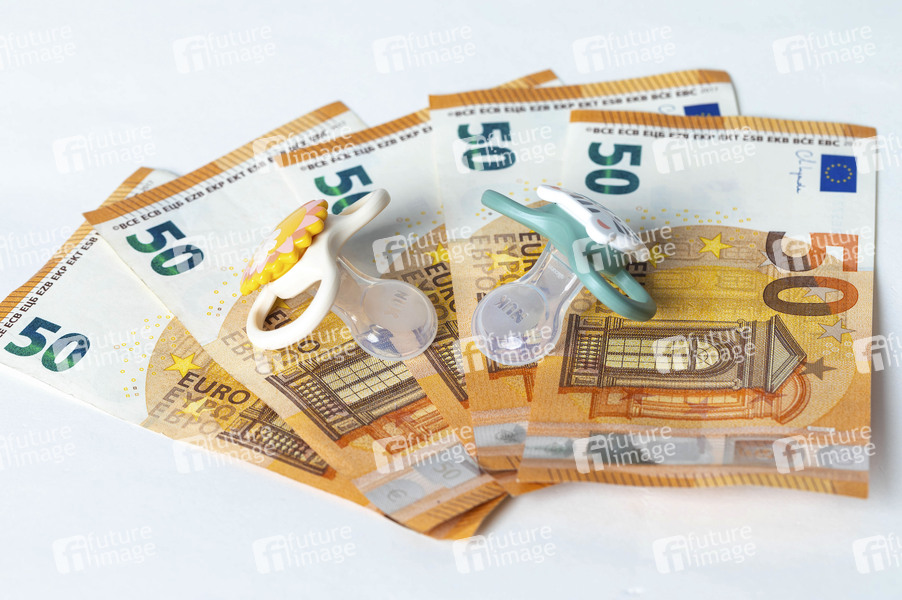 Familienbeihilfe, staatliche Leistungen an Erziehungsberechtigte, Versorgung, Grundversorgung, Grundsicherung, Unterstützung, Eltern, Kinder, Kinderzulage, Kindergeldzuschlag, Eikommen, Kinderbonus, Kindergeldanspruch, Kindergarantiebetrag, Geld, Banknoten, Geldscheine, Vermögen, Euro, €, Geldschein, Nuckel, Schnuller, Themenbild, Symbolbild