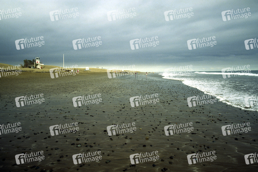 Strand, Meer, Atlantik, Canaren, Gran Canaria, dunkler Sand, dunkle Wolken, Weite, Horizont, Wellen, Rotes Kreuz, Seenotrettung, melancholisch, einsam, Einsamkeit, Freiheit, Tristes, Tourismus, Massentourismus, Abseits, Ebbe, Flut, Wasser