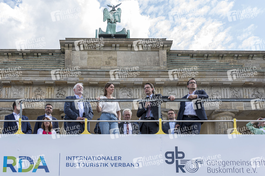 Bundesverkehrsminister Andreas Scheuer mit Vertretern der Reise- und Busunternehmen, Internationale Bustouristik Verband RDA, der Gütegemeinschaft Buskomfort und dem Bundesverband Deutscher Omnibusunternehmer (BDO) - Mit einer Bus-Sternfahrt und einer anschließenden Kundgebung am Brandenburger Tor fordern Busunternehmer, Reisebusunternehmer, Reiseagenturen und Reiseveranstalter erneut staatliche Hilfen zum Erhalt ihrer Arbeitsplätze. Aufgrund der Corona-Pandemie ist der Reiseverkehr immer noch stark eingeschränkt und die Hygieneregeln machen ein wirtschaftliches Arbeiten nahezu unmöglich. Berlin, 17.06.2020
