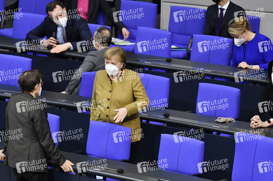 Karl Lauterbach, Jens Spahn, Heiko Maas, Angela Merkel und Franziska Giffey in der 209. Sitzung des Deutschen Bundestages im Reichstagsgebäude. Berlin, 11.02.2021