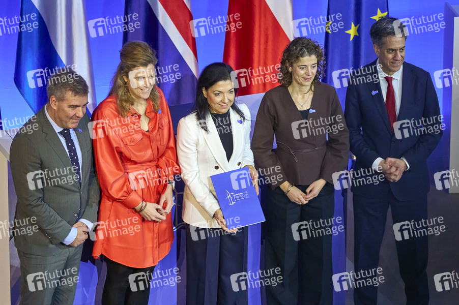 Lars Aagaard (Minister für Klima, Energie und Versorgung, Dänemark), Annelies Verlinden (Ministerin für Justiz und den belgischen Teil der Nordsee, Belgien), Katherina Reiche (Bundesministerin für Wirtschaft und Energie), Sophie Hermans (Ministerin für für Klimapolitik und grünes Wachstum, Niederlande) und Ed Miliband (Minister für Energiesicherheit und NetZero, Vereinigtes Königreich) bei der Unterzeichnungszeremonie beim 3. internationalen Nordsee-Gipfel 2026 auf Ebene der Regierungschefinnen und -chefs sowie der Energieministerinnen und Energieminister im Rathaus. Ziel des Gipfels ist es, den grenzüberschreitenden Ausbau der Offshore-Windenergie, den Wasserstoffmarkt und zugleich eine leistungsfähige und vernetzte Offshore-Infrastruktur im gesamten Nordseeraum weiter voranzutreiben. Hamburg, 26.01.2026
