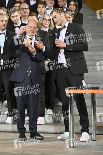 Der Zimmerer und Silbermedaillengewinner Philipp Kaiser überreicht dem Bundeskanzler einen aus sechs verschiedenen Hölzern gefertigten Weihnachtsstern beim Empfang der Deutschen Berufe-Nationalmannschaft im Bundeskanzleramt. Deutschland erzielte beim WorldSkills-Wettbewerb, der erstmals dezentral in 15 Nationen auf der ganzen Welt ausgetragen wurde, das beste Ergebnis seit mehr als 17 Jahren. Berlin, 08.12.2022