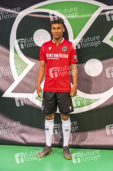Linton Maina mit rotem Heimtrikot bei der Präsentation der Hannover 96-Trikots des neuen Ausrüsters Macron für die Saison 2019/20 in der HDI Arena. Hannover, 16.06.2019