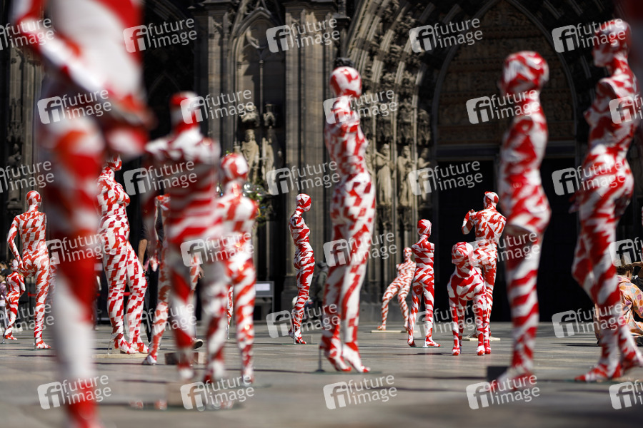 Kunst-Installation 'It is like it is - Mahnmal zur Coronakrise - 2020', einer Installation aus 111 maskierten Schaufensterpuppen, von Dennis Josef Meseg anlässlich der strengen Maßnahmen der Bundesregierung wegen der Coronakrise auf der Domplatte. Köln, 05.05.2020