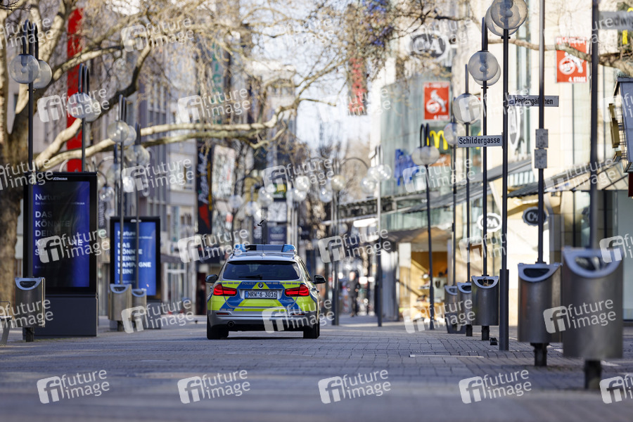 Die menschenleere Schildergasse mit Polizeistreife während der Corona-Krise. Köln, 22.03.2020