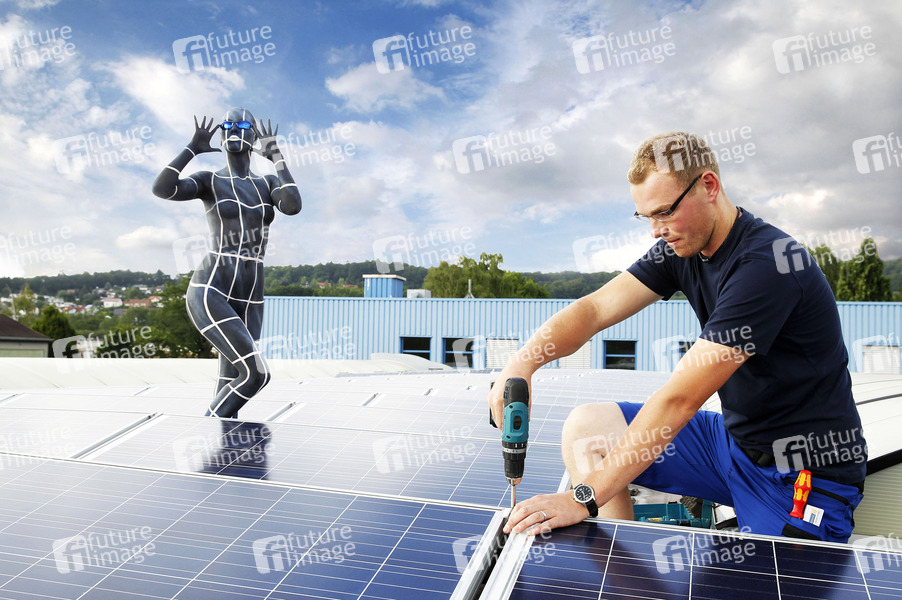 Solardach-Pflicht, Solarpflicht, Klimaschutz-Sofortprogramm 2022, Energie-Standard EH-55, Energie, Solarstrom, Solarzelle, Photovoltaik, Solarpanele, Solarenergie, Sonnenenergie, Solaranlage, Dach, Solarmodule, Nachhaltigkeit, Erneuerbare Energien, Energiewende, Solarzellen, Klima, Umwelt, Ökostrom, Umweltschutz, Body-Painting, Akt, Körperkunst, Körperfarben, Farbe, Bemalung, Kunst, Malerei, Beruf, Solarteur, Strom, Symbolfoto, Symolbild, Model Release