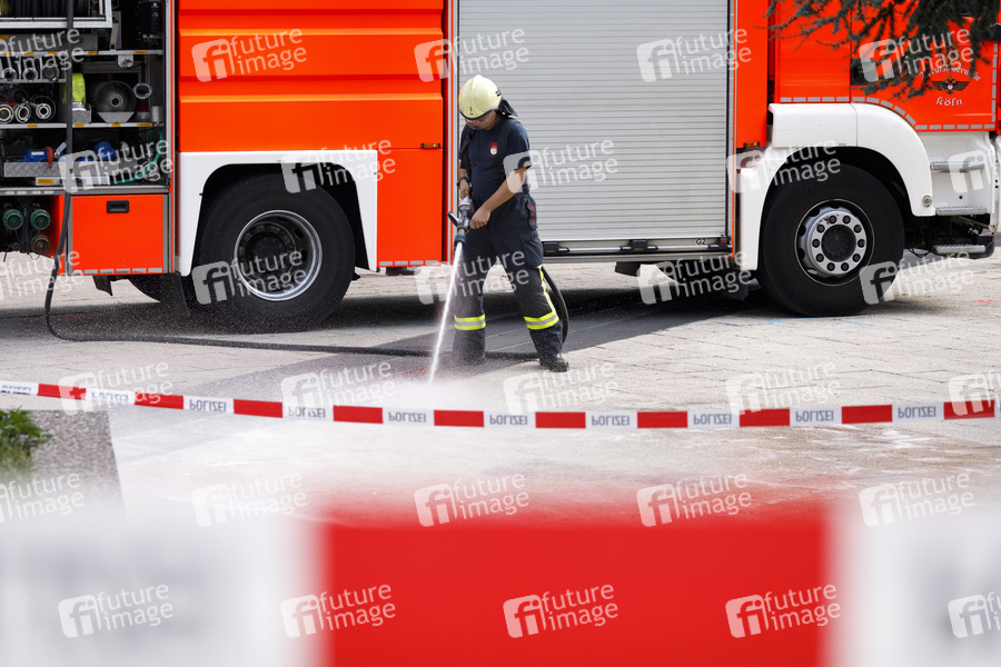 Die Kölner Feuerwehr erledigt die Tatortreinigung nach der Pressekonferenz zum laufenden Stand der Ermittlungen nach dem Tötungsdelikt am Ebertplatz. Köln, 25.08.2019