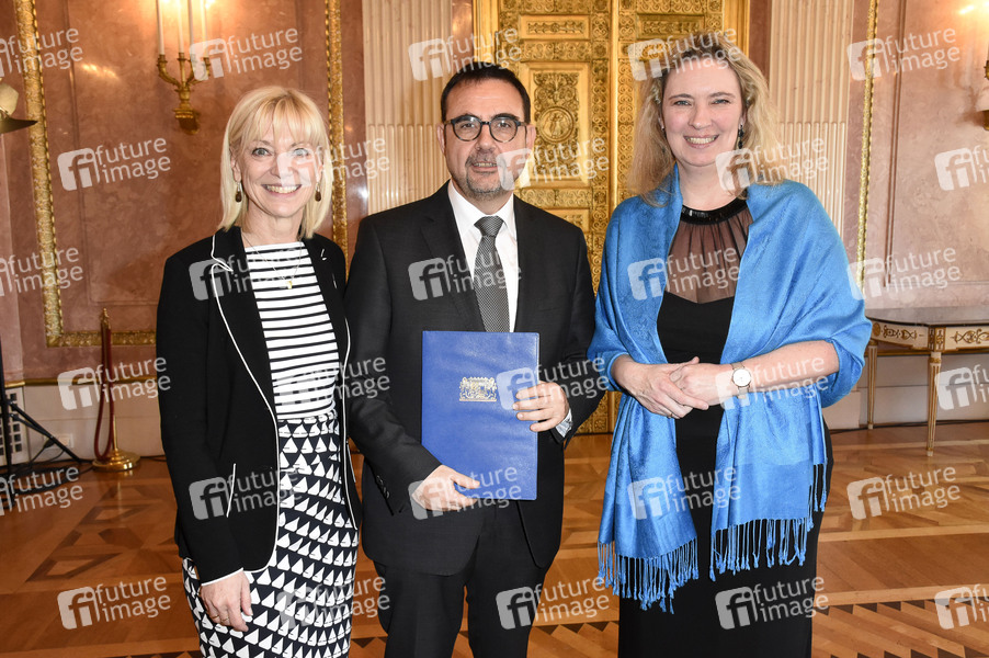 Carolina Trautner (Staatsministerin für Familie, Arbeit und Soziales), Kerstin Schreyer (Staatsministerin für Wohnen, Bau und Verkehr) und Klaus Holetschek (Staatssekretär für Wohnen, Bau und Verkehr) bei der Aushändigung der Ernennungsurkunden an die neuen Kabinettsmitglieder im Prinz-Carl-Palais. München, 06.02.2020