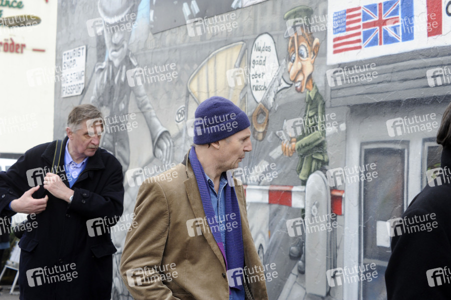 Liam Neeson besucht die Berliner Mauer an der East Side Gallery während einer Drehpause zu seinem Thriller 'Unknown Identity'