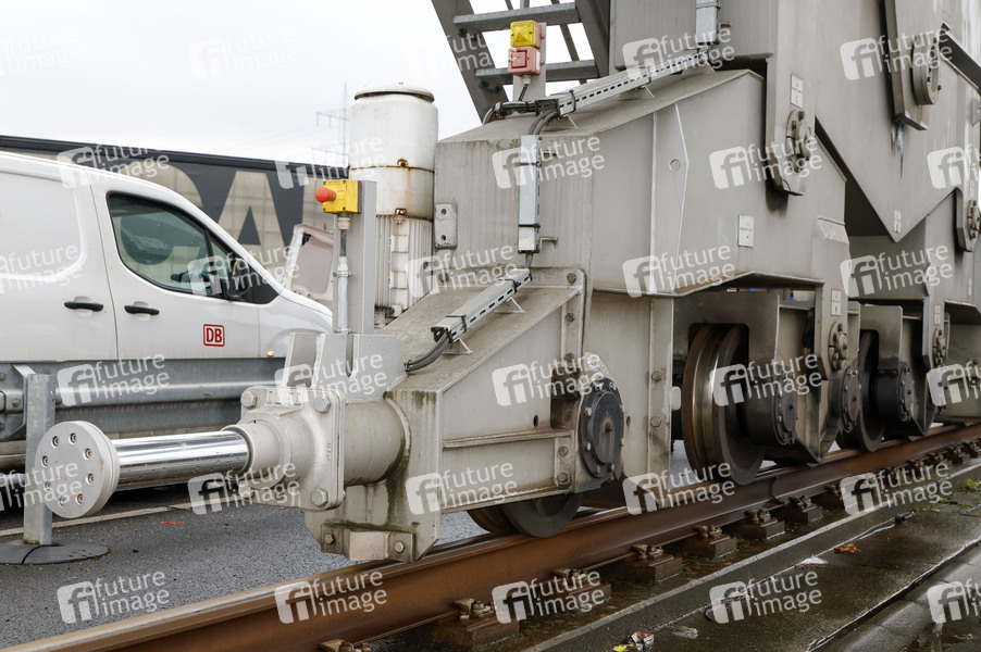 Portalkranantrieb beim Fototermin 'DB montiert 400 Tonnen schwere neue Krananlage' im DUSS-Terminal Köln-Eifeltor. Köln, 23.01.2025