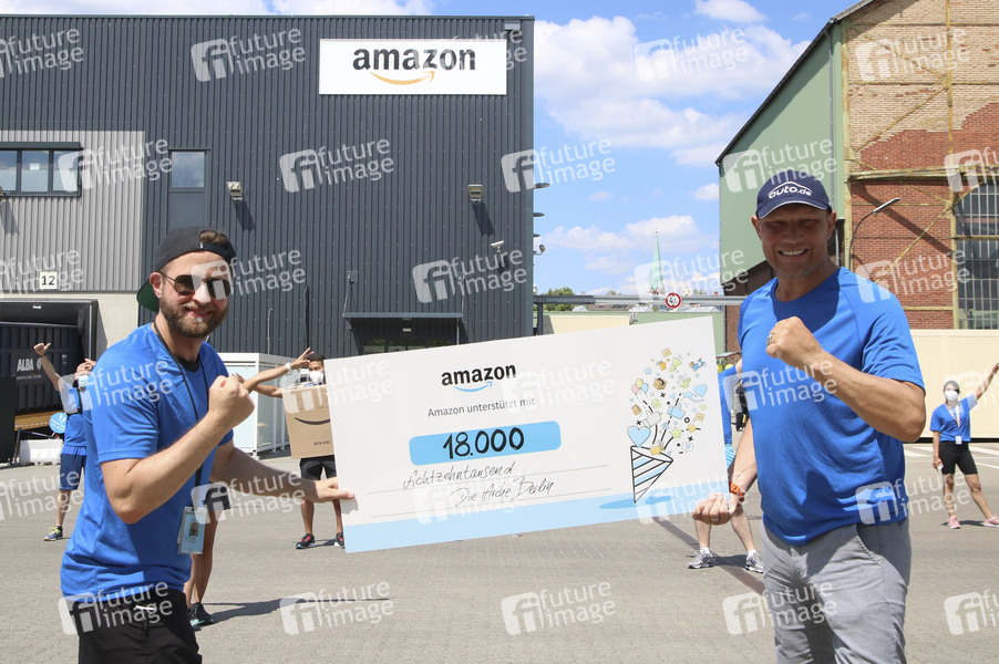 Tim Stapf und Axel Schulz bei Scheckübergabe von Amazon an die Arche. Zahlreiche Mitarbeiter aus vier Amazon Verteilzentren in Berlin/Brandenburg laufen eine Woche lang gemeinsam für den guten Zweck. Für jeden gelaufenen Kilometer spendet Amazon einen Euro an die Arche, um damit die nachhaltige Arbeit zugunsten benachteiligter Kinder und Jugendlicher zu fördern. Bei der Charity-Aktion wird diesmal mit einer Spendensumme in Höhe von insgesamt 18.000 Euro gerechnet. Vor dem finalen Lauf am Borsigturm in Berlin-Tegel gibt Boxlegende Axel Schulz den Läufern und Läuferinnen Tipps aus seiner Erfahrung als Sportler und nimmt von Amazon-Standortleiter Tim Stapf den Spendenscheck für die Arche entgegennehmen. Berlin, 11.06.2021