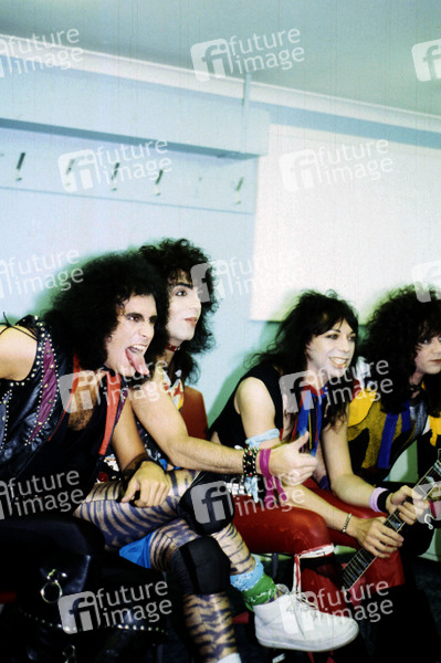 Gene Simmons / The Demon, Paul Stanley / The Starchild, Vinnie Vincent / The Ankh Warrior und Eric Carr / The Fox von Kiss bei der Pressekonferenz zur 'Lick it up'-Tour in der Wembley Arena. London, 23.10.1983
