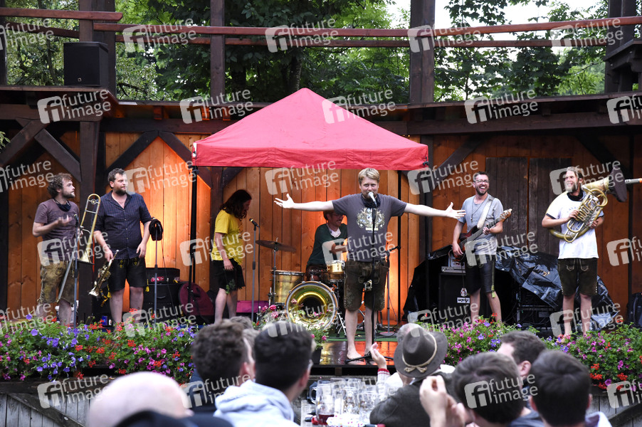 LaBrassBanda bei einem Konzert im Rahmen der Biergarten-Tour unter dem Motto 'Rettet die Wirte & die Kultur' in der Ritterschwemme auf Schloss Kaltenberg. Geltendorf, 26.07.2020