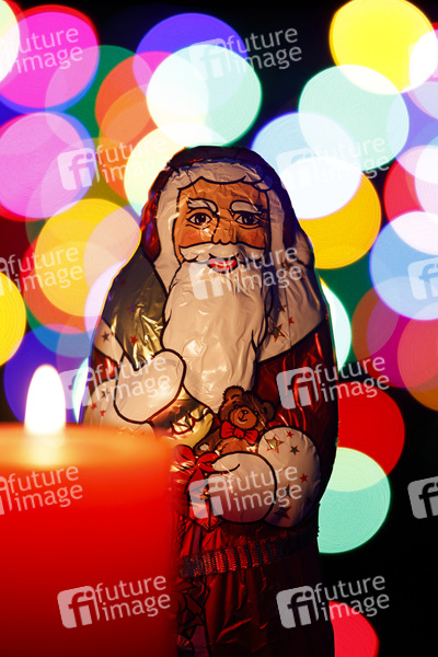 Ein Schoko-Weihnachtsmann von Lindt steht vor einer brennenden Adventskerze. Im Hintergrund eine Lichterkette. (Themenbild, Symbolbild)