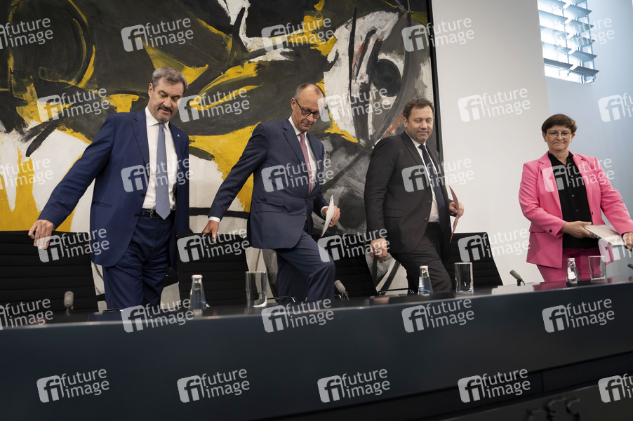 Markus Söder, Friedrich Merz, Lars Klingbeil und Saskia Esken bei der Pressekonferenz nach der ersten Sitzung des Koalitionsausschusses von Union und SPD im Kanzleramt. Berlin, 28.05.2025