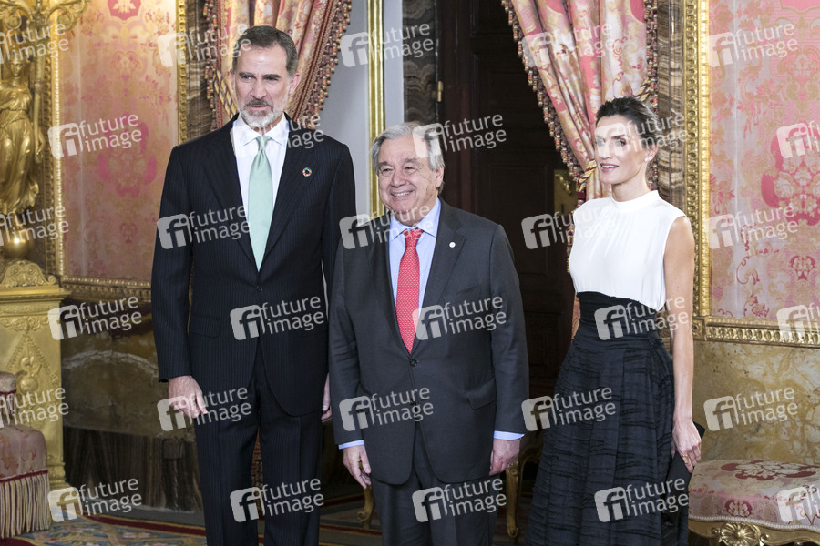 König Felipe von Spanien, Antonio Guterres und Königin Letizia von Spanien bei einem Empfang anlässlich der UN-Klimakonferenz 2019 im Palacio Real. Madrid, 02.12.2019