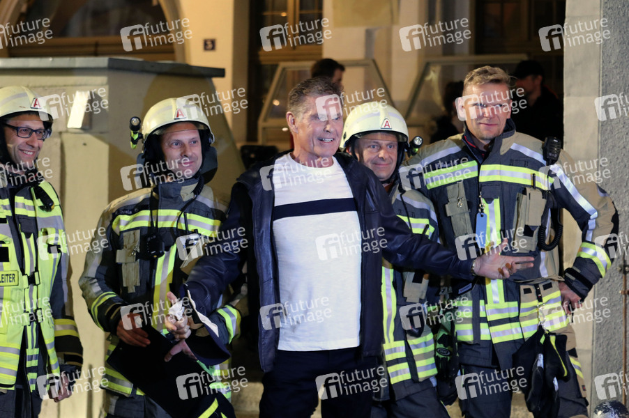 David Hasselhoff am Set zu Dreharbeiten für die TV Now Serie 'Ze Network' auf dem Untermarkt. Der Einsatz von Nebelmaschinen setzte die Brandmelder im Schlesischen Museum in Gang und löste einen nicht geplanten Großeinsatz der Görlitzer Feuerwehr aus. Zum Dank für ihren Einsatz ließ sich sich David Hasselhoff mit den Feuerwehrleuten fotografieren.. Görlitz, 05.10.2021