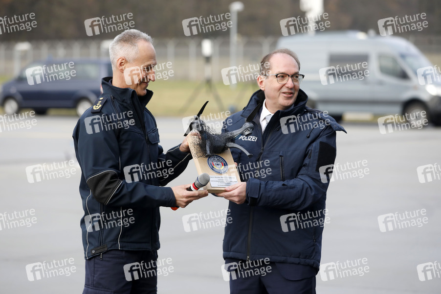 Olaf Lindner und Alexander Dobrindt bei der Indienststellung der Drohnenabwehreinheit der Bundespolizei bei der Bundespolizei-Fliegerstaffel Blumberg. Ahrensfelde, 02.12.2025
