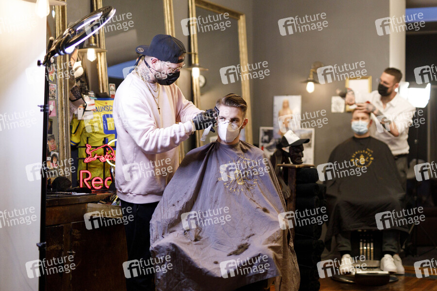 Barber, Barbier, Barber-Shop, Barber-Shops, Friseur, Friseure, Corona-Maßnahmen, Coronamaßnahmen, Coronakrise, Corona-Krise, Schutzkleidung, Spritzschutz, Frisör, Frisur, Friseure, Friseur, Friseurbesuch, Salon, Bart schneiden, Bartschnitt, Haare schneiden, Haarschnitt, frisieren, Fönen, Waschen, Legen, Corona, Virus, Sars-CoV-2, Covid-19, Coronavirus, Corona-Virus, Coronaviren, Corona-Viren, Corona-Lockerungen, Lockerungen, Pandemie, Epidemie, RKI-Zahlen, Neuansteckungen, zurück zur Normalität, Corona-Schutz, Exit-Strategie, Kundenkontakt, Ausnahmesituation, Atemschutz, Atemschutzmaske, Virenschutz, Schutzmaske, Schutzmasken, Atemschutzmasken, Maske, Masken, Mundschutz, Mund-Schutz, Mundschutzpflicht, Maskenpflicht, Mindestabstand, Hygiene, Hygienekonzept, Inzidenzwert, Mundschutz-Pflicht, Mund-Nasen-Schutz, MNS, Corona-Regeln, Coronaregeln, Lockdown, Lockdowns, Lock Down, Öffnung, Öffnungen, dritte Welle, Symbolbild, Symbolfoto