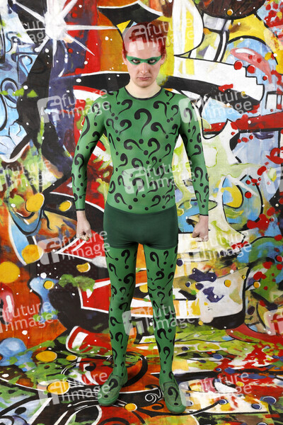 Cosplay, Cosplayer, Bodypainting, Body-Painting, Make-up, Maskenbildnerei, Körperkunst, Körperfarben, Projekt Farbkörper, Farbe, Bemalung, Kunst, Malerei, Comic, DC Comics, Comicfigur, Verbrecher, Psychopath, Batman-Gegner, Edward Nygma, Fragezeichen, Rätzel, body painting, body art, project color body, colors, colours, villain, comic character, criminal, psychopath, Batman opponent, question mark, riddle