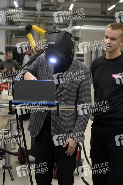 Christian Lindner beim Lehrgang virtuelles Schweißen mit Schweißermaske während des Rundgangs im ABB-Ausbildungszentrum Berlin-Pankow. Berlin, 16.09.2024