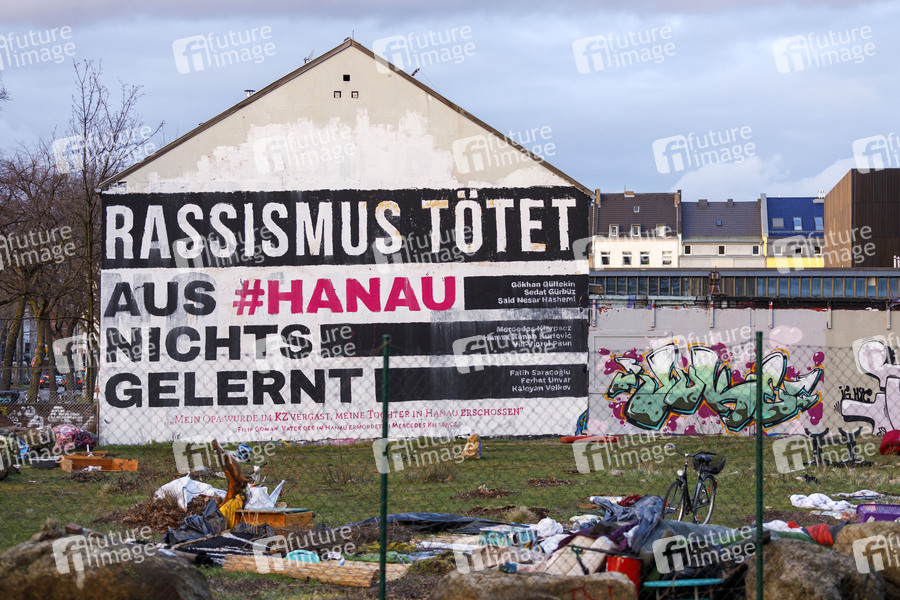 Das Autonome Zentrum Köln an der Luxemburger Straße. Das Gelände, das oft vermüllt wirkt und früher zum ehemaligen Kanalbauamt gehörte, soll im Rahmen der Planungen für die Parkstadt-Süd in einen Park verwandelt werden. Verhandlungen über einen Alternativ-Standort waren bisher gescheitert. Ein Graffiti an der Außenseite soll an das Attentat von Hanau erinnern. Köln, 13.03.2021