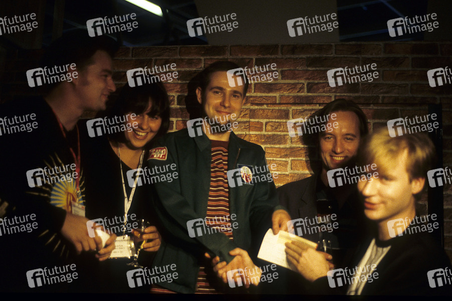 Andreas Dorau (Mitte) und Tim Renner (rechts) und andere auf der Popkomm Cologne. Köln, 18.08.1994