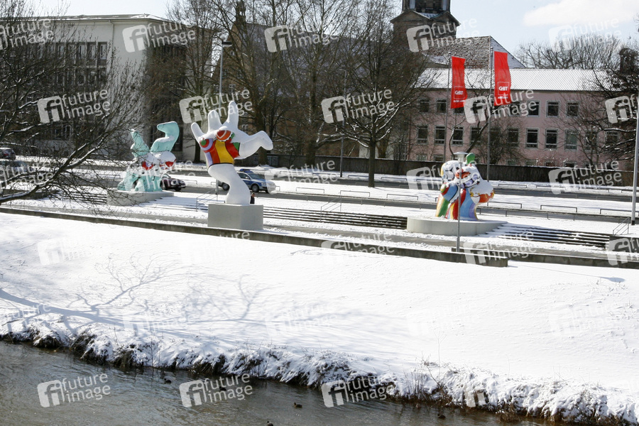 Kunstwerk von Niki de Saint Phalle von 1974, Frauenfiguren mit überdimensionierten Geschlechtsteilen, Leineufer, Kunst, Pop-Art, Schnee, Leine